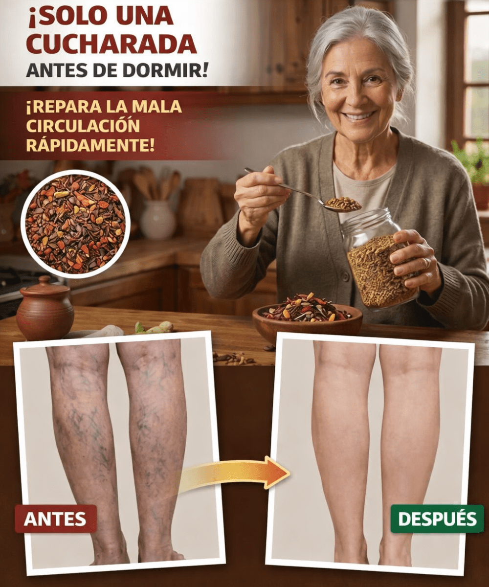 Sentir las piernas pesadas al final del día, con esa hinchazón que no baja y el hormigueo constante en los pies que te despierta por las noches, es algo que muchos adultos mayores conocen muy bien. Esa incomodidad no solo te quita el sueño, sino que también te hace preocuparte por problemas más serios como varices visibles o cansancio que no te deja disfrutar a tus nietos o salir a caminar como antes. Lo peor es que parece que nada funciona del todo. Pero hay un remedio natural, sencillo y hecho en casa que muchas personas mayores están usando para sentir las piernas más ligeras y descansar mejor. Y lo más sorprendente… solo necesitas una cucharada antes de dormir. Sigue leyendo, porque te voy a contar exactamente qué es y cómo prepararlo.