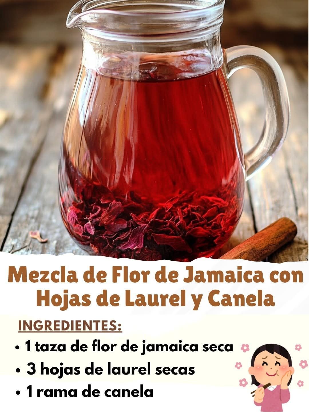 Bebida potente y natural, perfecta para todas las mujeres, que combina ingredientes como la canela, clavos de olor, flor de jamaica y laurel. Esta mezcla es deliciosa, saludable y tiene varios beneficios para el cuerpo, como mejorar la circulación, aliviar el malestar digestivo, equilibrar las hormonas y fortalecer el sistema inmunológico.