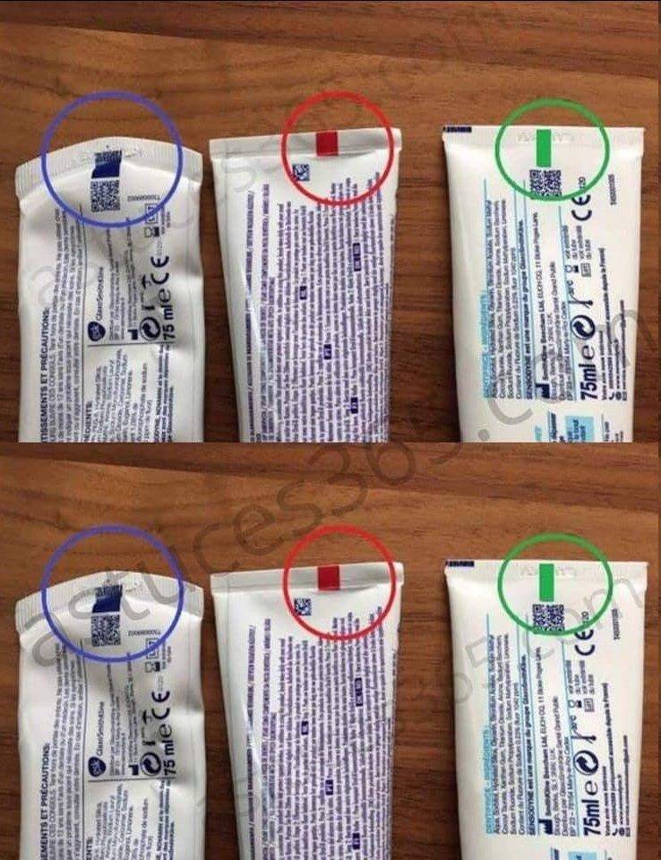 Este es un color ligeramente peor que la pasta de dientes azul. La pasta de dientes con una raya de color rojo indica que la pasta de dientes es una combinación de compuestos químicos naturales y sintéticos. Normalmente, quieres tener la menor cantidad posible de productos químicos en tu vida.