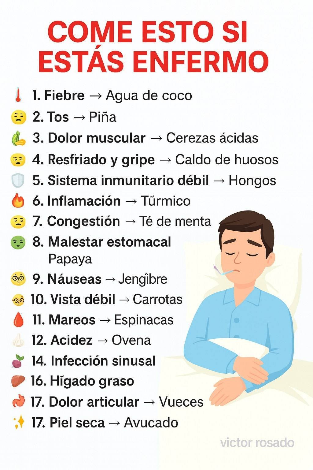 Cuando nos enfermamos solemos pensar solo en pastillas y jarabes, pero lo que ponemos en el plato también puede marcar una gran diferencia. Algunos alimentos aportan hidratación, vitaminas, minerales y compuestos naturales que ayudan al cuerpo a defenderse y a recuperarse más rápido. A continuación tienes una explicación detallada de cada combinación de la imagen, para que entiendas por qué puede ayudarte en momentos de malestar.