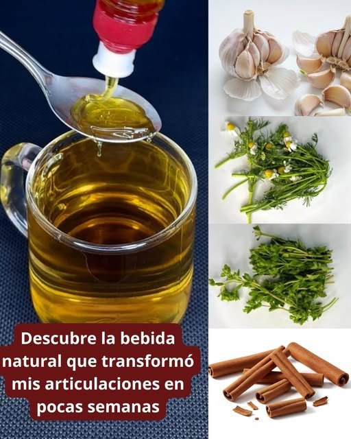 Los ingredientes que ves en la imagen —canela, manzanilla, cilantro, perejil, ajo y miel— son conocidos por sus propiedades antiinflamatorias, antioxidantes y desintoxicantes.