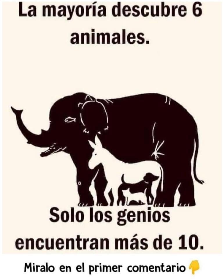 más Si no pudiste completar el reto, a modo de tip te contamos cuáles son los animales que se encuentran escondidos: Elefante Gato Pez Tortuga Burro Ratón Delfín Serpiente Cocodrilo Pollo Perro Camarón Mosquito ¿Aún no logras verlos? No te preocupes, más adelante te contamos la respuesta.