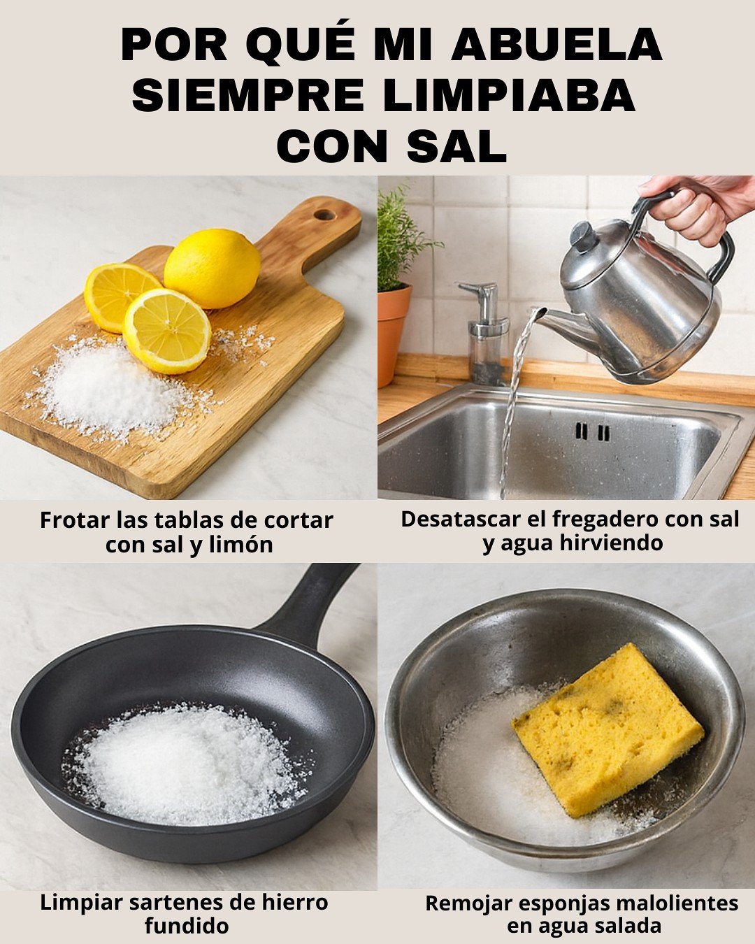 Tips de la abuela 1. Frotar las tablas de cortar con sal y limón 2. Desatascar el fregadero con sal y agua hirviendo 3. Remojar esponjas malolientes en agua salada 4. Limpiar sartenes de hierro fundido 5. Pulir metales deslústralos de forma natural
