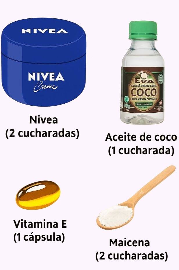 Ingredientes: • 2 cucharadas de crema Nivea clásica (lata azul): Aporta hidratación profunda. • 1 cucharada de aceite de coco virgen: Nutre y repara la piel. • 2 cucharadas de maicena: Suaviza la piel y controla el brillo. • 1 cápsula de vitamina E (opcional): Potente antioxidante que regenera la piel. Instrucciones:
